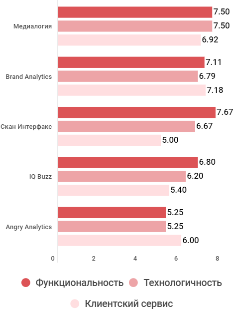 баллы у лидеров неровные, и если у Медиалогии и Brand Analytics это