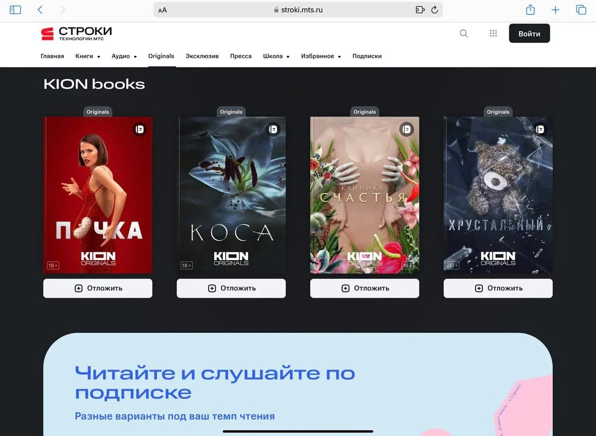 Книжная платформа «Строки» выпустит оригинальные сериалы Kion в формате книг