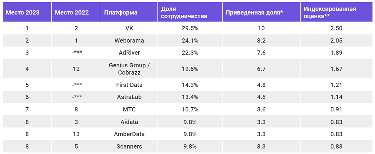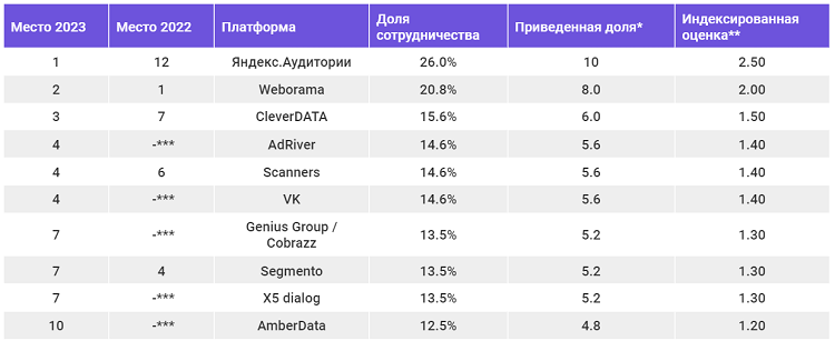 Яндекс.Аудитории же, наоборот, при самой большой доле сотрудничества оказался