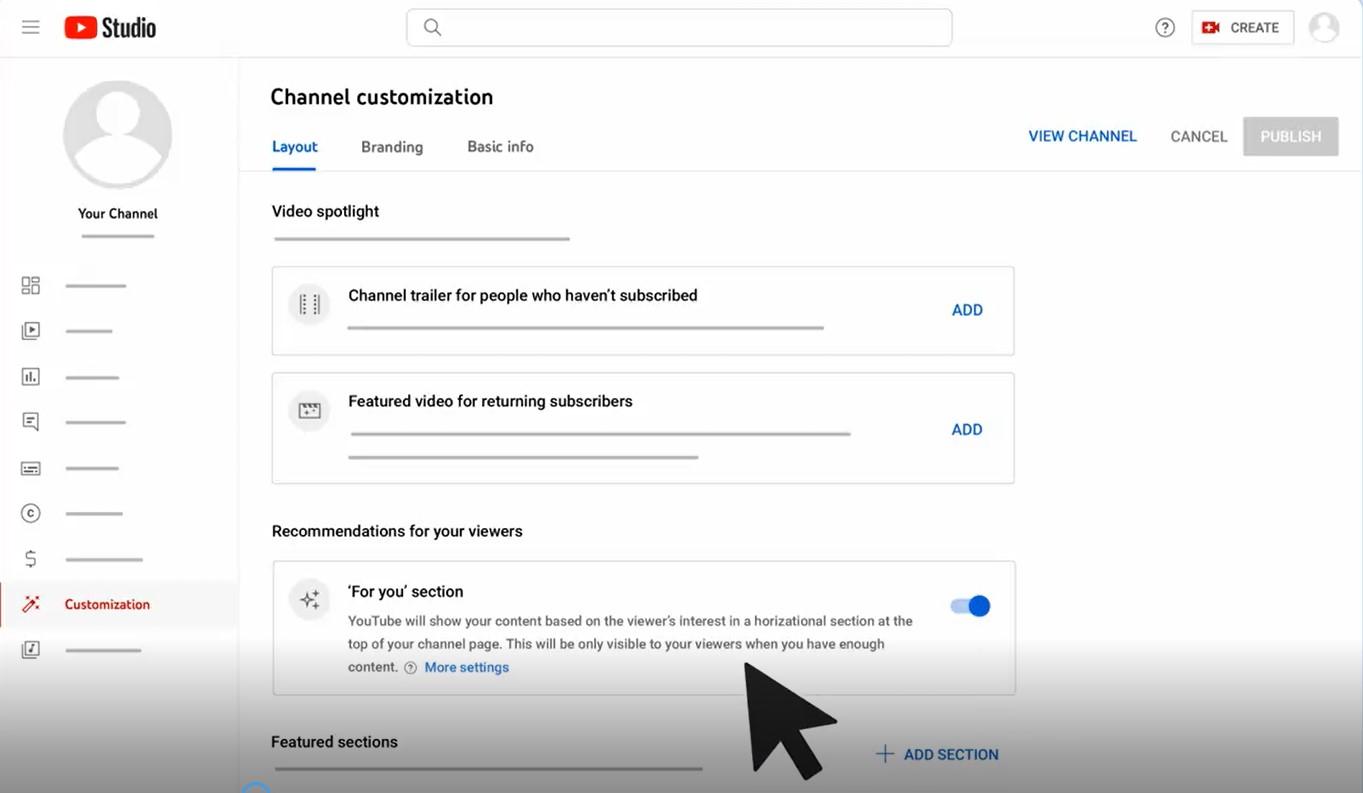 частности, в YouTube Studio, во вкладке Customization и подразделе Layout можно
