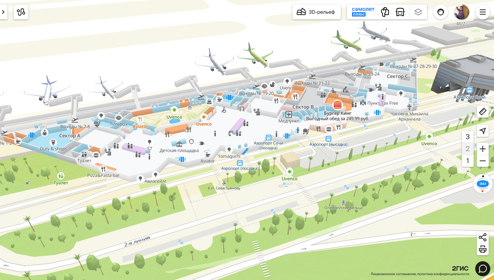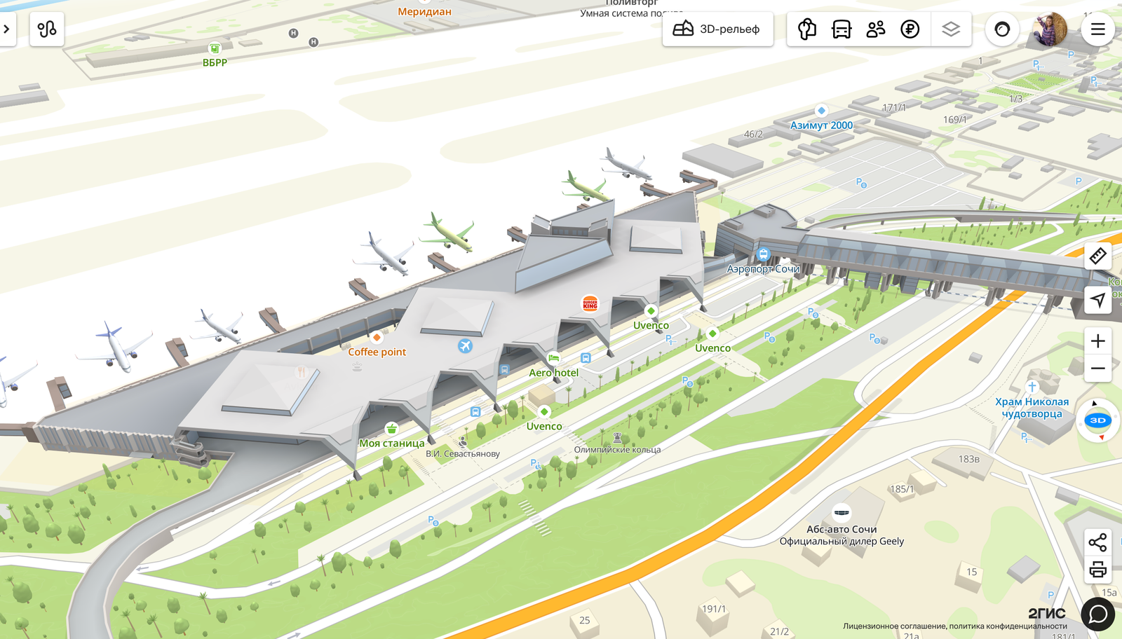 Реалистичная 3D-модель аэропорта доступна на сайте 2gis.ru, а также в