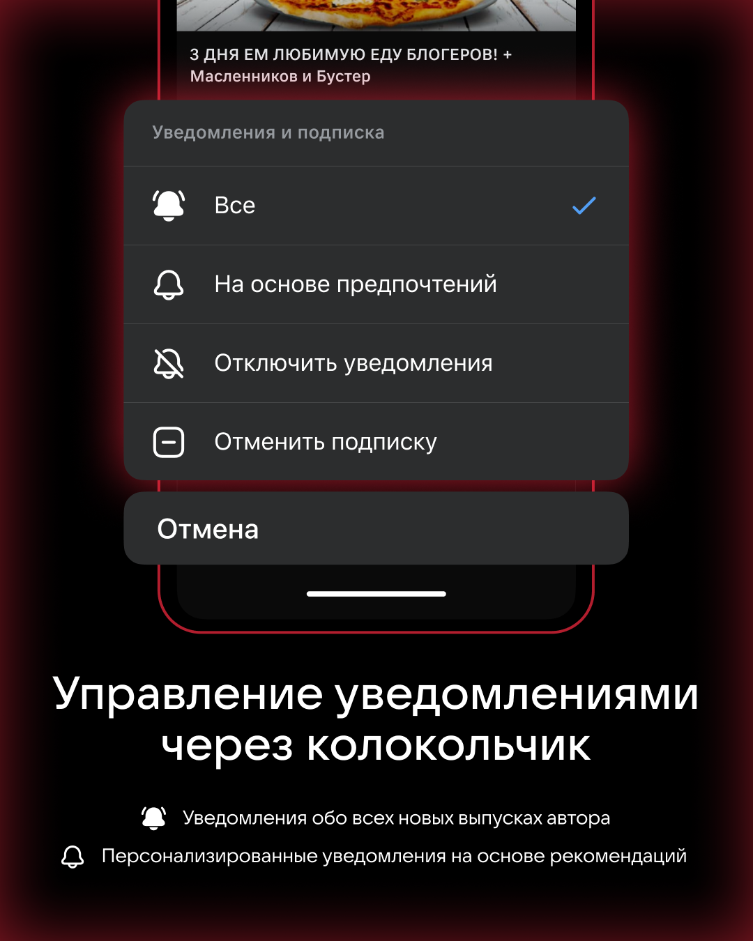 уведомлениями в одном окне — через кнопку «колокольчика» под видео. При выборе