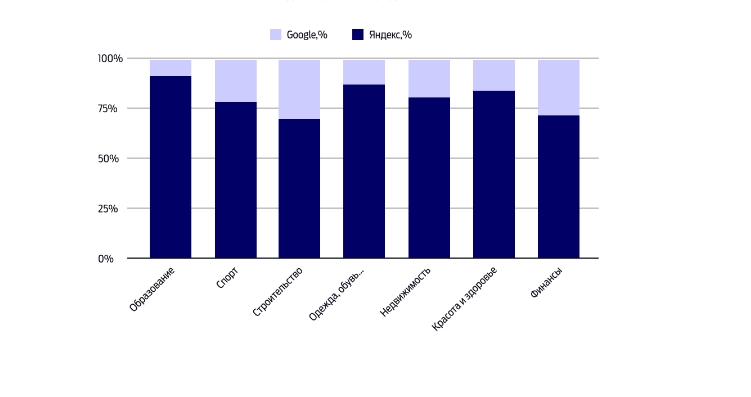на Google, в то время как остальные 91% — на «Яндекс». В «Строительстве» Google